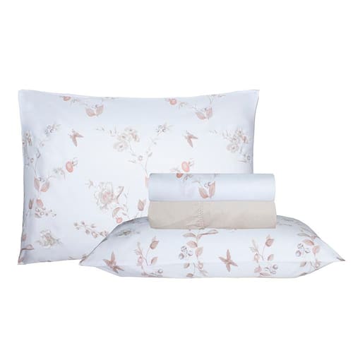 Cor: Lençol de Baixo na cor Bege com pontos Branco e o Lençol de Cima e fronhas na cor branco com detalhes de flores e borboletas.