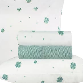 Cor: Lençol de Baixo na cor Verde com pontos Branco e o Lençol de Cima e as Fronhas na cor Branco com Trevos Verde