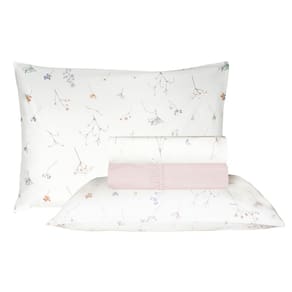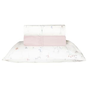 Cor: Lençol de Baixo na cor Rosa com pontos Branco e o Lençol de Cima na cor Branco com flores