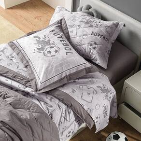 O lençol com elástico neutro na cor cinza, proporciona um contraste elegante e versátil. O sobre lençol é adornado com uma estampa dinâmica que inclui luvas de goleiros, bolas de futebol, chuteiras e troféus, capturando a essência do campeonato e inspirando sonhos de vitória. A fronha, com quatro abas de 4 cm, exibe uma bola em campo, completando o conjunto com um toque de autenticidade esportiva.