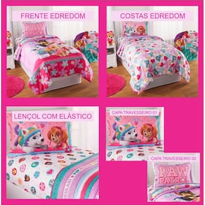 1 edredom dupla face infantil de 260cm largura por 260cm comprimento - Frente estampa Patrulha Canina Skye em grande dimensão - Costas estampa Patrulha Canina Skye em estilo rapport personagens. 1 lençol com elástico para colchão casal queen de até 40cm de altura - Estampa Patrulha Canina Skye em estilo rapport personagens. 2 fronhas estampadas de 70cmx50cm - Frente e costas estampa Skye Patrulha Canina