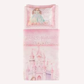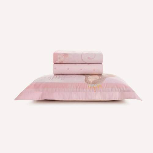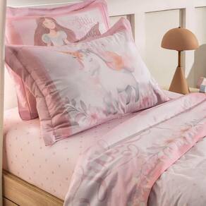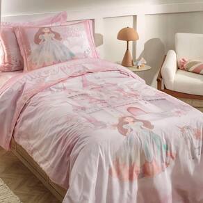 Com estampa exclusiva e atmosfera de conto de fadas, o jogo de cama Princesinha encanta com a imagem de uma princesa e seu unicórnio diante de um castelo nas nuvens. A fronha dimensionada destaca a personagem, enquanto o sobre lençol tem fundo rosado e vira com delicados ramos florais. O lençol com elástico traz padronagem ornamental suave, com pequenas coroas. É uma peça mágica e delicada para o quarto infantil. Combina perfeitamente com complementos em tons de rosa.
