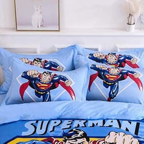 1 edredom dupla face infantil de 145cm largura por 230cm comprimento - Frente estampa Super-Homem em grande dimensão - Costas lisa, sem estampa em azul bebê. 1 lençol com elástico para colchão solteiro comum de até 30cm de altura - Lençol liso, sem estampa em azul bebê - Na mesma tonalidade do edredom. 2 fronhas estampadas de 70cmx50cm - Frente estampa Homem-Aranha e costas lisa em azul bebê.