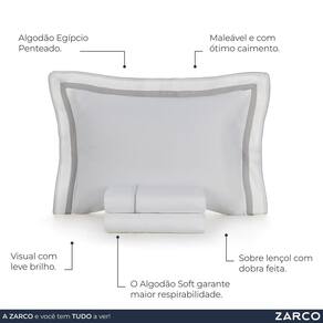 Principais CARACTERÍSTICAS: . Vira do sobre lençol com filete aplicado e pala de 10cm; . Lençol com elástico tinto; . Fronha com 3 abas de 7cm, bordo sobreposto de 2,5cm e cordonê aplicado nos 3 lados; . Antipilling; . Hipoalergênico; . Algodão Soft; . Algodão Egípcio Penteado de fibra longa; . Toque Supremo; . Altamente respirável; . Fácil de passar; . Natural; . Maleável e com ótimo caimento; . Visual com leve brilho.