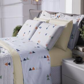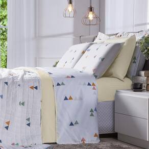 Contém na embalagem: 1 Lençol de cima sem elástico estampado 2,90m x 2,80m 1 Lençol de baixo com elástico liso 2,03m x 1,93m x 40cm 2 Fronhas estampadas 70cm x 50cm