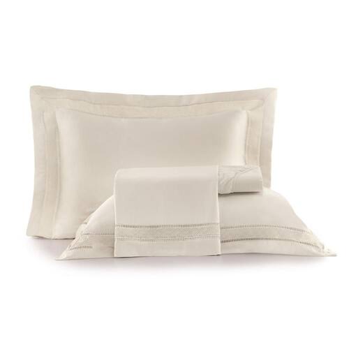 O jogo é composto por duas fronhas com aplicação de rendas nas quatro abas, um lençol de cima com detalhe de dobra feita e aplicação de bordados em U, e um lençol com elástico para um ajuste perfeito ao colchão.