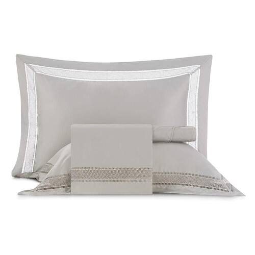 O jogo é composto por duas fronhas com aplicação de rendas nas quatro abas de 9 cm, um lençol de cima com detalhe de dobra feita e aplicação de bordados em U, e um lençol com elástico para um ajuste perfeito ao colchão.