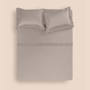 O cetim de 600 fios em puro algodão tem estrutura hiper lisa e toque refrescante. É o tipo de tecido que não gera atrito com o cabelo, muito menos com a pele, sendo também hipoalergênico. Uma fibra natural, o algodão é durável, macio e respirável. Os lençóis absorvem o calor do corpo, o que funciona como um termostato natural, mantendo frescor no verão e proteção ao frio no inverno e as fronhas não irritam a pele mais sensível do rosto. O cetim tem um brilho único que resulta em beleza incomparável.