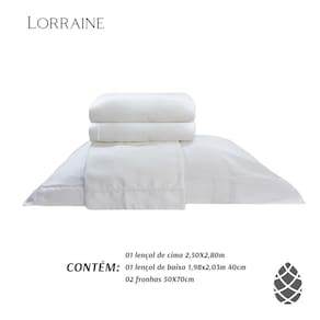 Lençol de cima 2,80 m x 2,50 m Lençol de baixo 1,98 m x 2,03 m x 40 cm Fronha 70 cm x 50 cm + 6 cm