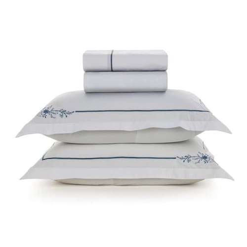 O conjunto é composto por 1 sobre lençol tinto com pala de 10 cm, dobra feita e filete aplicado, além de 1 lençol com elástico tinto que se ajusta perfeitamente ao colchão. Para completar, inclui 2 fronhas com 3 abas de 4 cm, bordado delicado e acabamento em ponto royal, traduzindo elegância em cada detalhe. Uma peça que transforma a experiência do dormir em puro bem-estar e sofisticação.
