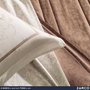 O lençol com elástico estampado ajusta-se perfeitamente ao colchão, enquanto o sobre lençol com dobra feita imprime um acabamento impecável à cama posta. As duas fronhas dimensionadas, com quatro abas de 4 cm, garantem caimento elegante e valorizam a composição. Para completar, a capa de almofada tinto recebe um bordado localizado e acabamento em cordonê nos quatro lados — um toque de delicadeza que transforma o ambiente.