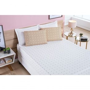 Jogo De Cama Lençol 200 Fios Petit Poá Casal Padrão 03 Peças - Caqui O Jogo de Cama Petit Poá possui tecido micro percal 200 fios com estampa clássica com bolinhas, é fácil de lavar e seca rápido! Produto composto por: 01 Lençol de baixo c/ elástico p/ colchão de 1,88m x 1,38m x 30cm de altura02 Fronhas 70cm x 50cm Composição: Tecido: 100% Poliéster Ean: 7908125129244
