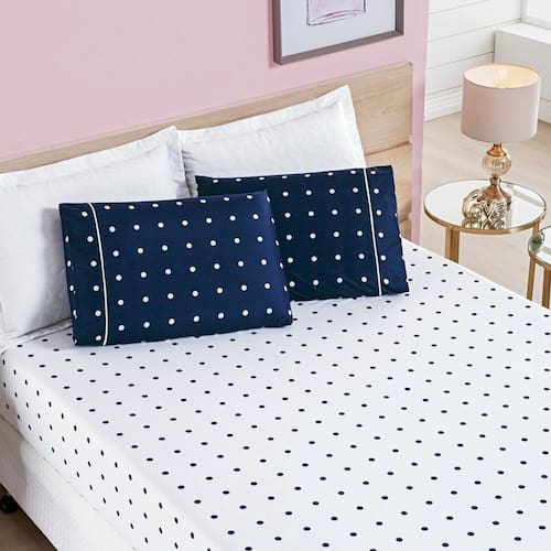 O Jogo de Cama Petit Poá possui tecido micro percal 200 fios com estampa clássica com bolinhas, é fácil de lavar e seca rápido!