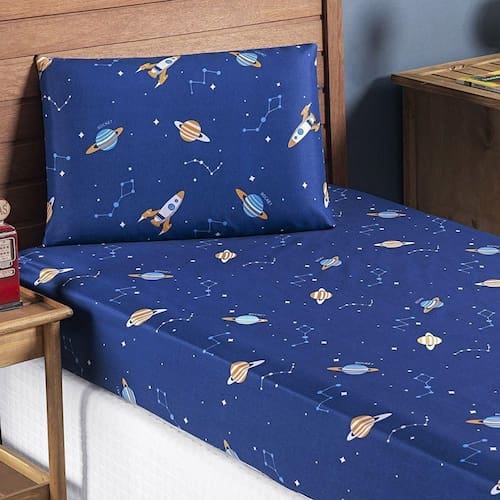 Jogo De Cama Lençol Bouti Infantil Kids Solteiro 02 Peças 100% Poliéster - Galáxia O Jogo de Cama Bouti Solteiro 02 peças é para deixar o quarto com um charme e harmonia sem igual. Composta por belas estampas que enchem o quarto de delicadeza, além de ser uma peça leve e prática para o seu dia a dia. Ah e o Lençol debaixo tem elástico em toda sua volta.
