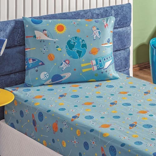 Jogo De Cama Lençol Carrosel Solteiro 02 Peças Infantil Estampado Divertido - Astronauta Azul