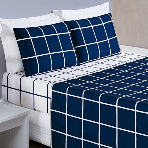 Jogo De Cama Lençol Minimalista Quadriculado Casal Padrão 04 Peças Tecido Micropercal 200 Fios Premium Cor Azul Marinho