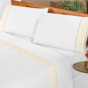 em tons suaves e aconchegantes, possui detalhe em ponto palito nas fronhas e no lençol de cima com uma faixa do mesmo tecido tom sobre tom. Produto composto por: 01 Lençol de Cima 2,60m x 2,40m01 Lençol de Baixo com Elástico 2,65m x 2,25m p/ colchão de 1,98m x 1,58cm x 30cm02 Fronha 70cm x 50cm Tecido: Percal 180 Fios Composição: Tecido: 80% Algodão 20% Poliéster Fotos meramente ilustrativas.A foto não representa obrigatoriamente todas as peças que compõem o produto.Fique atento à descrição do produto.As cores podem variar de acordo com cada monitor.