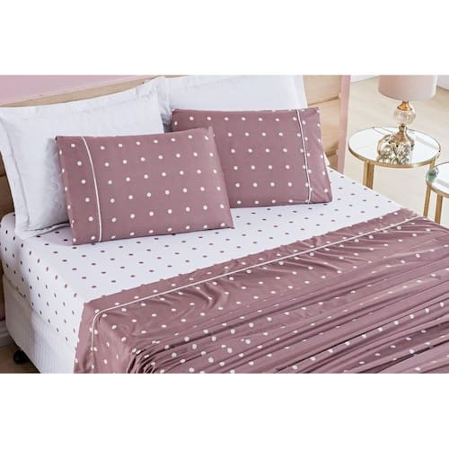 Jogo de cama confeccionado em tecido extremamente macio, 200 fios, com alta qualidade e durabilidade, em estampa de poá, que traz todo o charme nas decorações e acabamento impecável com viés, composto por um lençol de cima, com detalhe de viés, um lençol elásticado na volta toda, que veste o colchão como uma luva, e duas fronhas com detalhe em viés como o lençol de cima. Você merece este carinho 3 Marca: Nathalia Enxovais