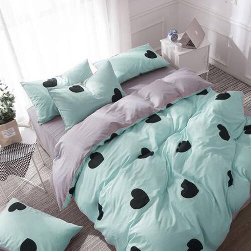 1 lençol com elástico para colchões de até 40 cm de altura - Lençol cinza claro 1 edredom dupla face com enchimento 260x260cm - Frente cor tiffany com estampa corações preto - Costas cinza claro no mesmo tom do lençol. 4 capas de travesseiros de 70cm x 50cm sem enchimento - Cor tiffany com estampa corações preto. Sem enchimento