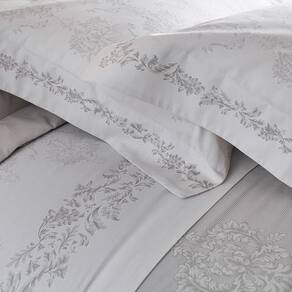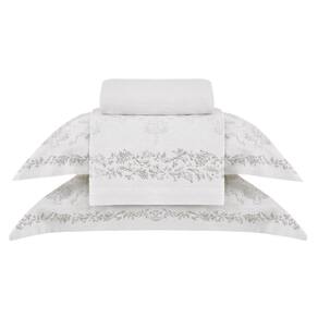 A estamparia com arabescos em tons de cinza e moldura em mini arranjos florais destacam-se no sobre lençol e fronhas com elegância e refinamento. A base do lençol vem em padrão xadrez conferindo harmonioso complemento. Em puro algodão com fibras longas, o modelo possui a suavidade e maciez incrível do toque acetinado. Muito confortável, resistente e fácil de manter.
