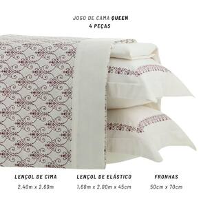 Contém: 04 Peças 01 Lençol de cima com vira Queen 2,40x2,60m 01 Lençol de baixo Queen com Elástico 1,60x2,00m com 45cm de altura 02 Fronhas 0,50x0,70m Estampa: Nissi