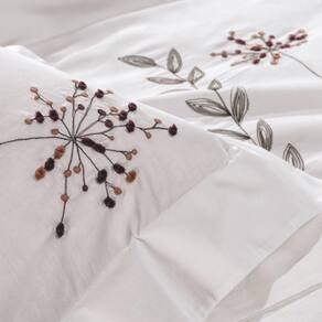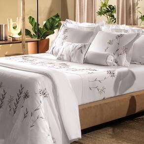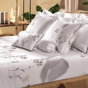 A coleção completa inclui jogo de cama, jogo de colcha e almofada decorativa, todos com a mesma proposta visual: flores em tons suaves que transformam o quarto em um refúgio romântico. As fronhas e a colcha recebem o bordado em pontos delicados, criando um efeito visual encantador, enquanto a almofada complementa o conjunto com aconchego e beleza.