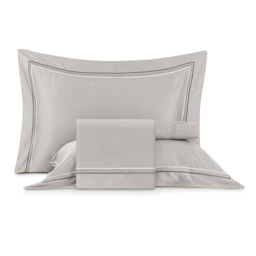 O conjunto é composto por 2 Fronhas (50cm x 70cm) com acabamento em festonê triplo nas três abas de 9cm, Lençol superior com dobra feita e aplicação de festonê triplo em U e Lençol com elástico, garantindo um ajuste perfeito ao colchão. Disponível em duas cores elegantes: branco, com sobreposição de tons, e cinza, com faixas em degradê.