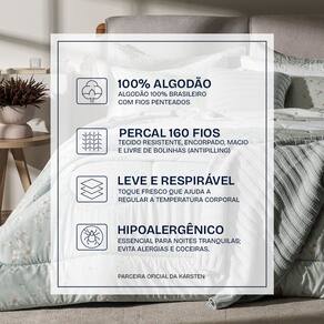 Diferenciais do produto Conforto: maciez do algodão com Toque Soft, que envolve o corpo com suavidade e frescor noite após noite, perfeito para um sono tranquilo em qualquer estação do ano. Elegância: acabamento e caimento impecável com bordados sutis, estampas delicadas e elástico em toda a volta, criando um visual sofisticado e acolhedor para o quarto. Padrão Karsten de qualidade: o algodão, além de hipoalergênico, é penteado: um processo especial que garante mais resistência, antipilling (não forma bolinhas) e respirabilidade, para um toque mais suave e fresco.
