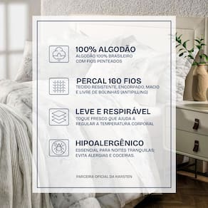 100% algodão penteado: toque extra macio e confortável Percal 160 Fios: maior durabilidade e sofisticação Tecnologia Antipilling: evita bolinhas e mantém a qualidade por mais tempo. Respirável e hipoalergênico: regula a temperatura e é ideal para peles sensíveis.