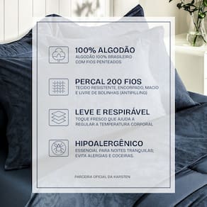 Feito com 100% algodão de fibras penteadas, esse jogo de cama une maciez, frescor e durabilidade. O percal 200 fios garante um toque suave e encorpado, que reduz o atrito com a pele para um descanso mais agradável. Ele ainda conta com tecnologia antipilling, que evita as indesejadas bolinhas, e é hipoalergênico, para noites tranquilas e livres de irritações.