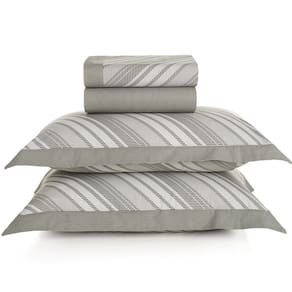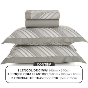 Sobre lençol (2,40m x 2,50m) com dobra feita; Lençol de elástico (1,58m x 1,98m x 40cm) com riscas finas; 2 fronhas (50cm x 70cm) com abas de 5cm.