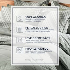 100% algodão penteado: toque extra macio e confortável Percal 200 Fios: maior durabilidade e sofisticação Tecnologia Antipilling: evita bolinhas e mantém a qualidade por mais tempo. Respirável e hipoalergênico: regula a temperatura e é ideal para peles sensíveis.