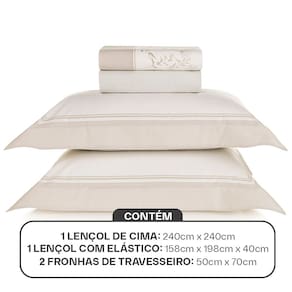 Sobre lençol (2,40m x 2,50m) com dobra feita; Lençol de elástico (1,58m x 1,98m x 40cm) com riscas finas; 2 fronhas (50cm x 70cm) com abas de 5cm.