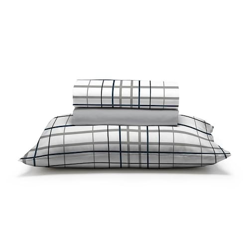 Jogo de cama com lençol inferior com elástico e lençol superior sem elástico com acabamento.