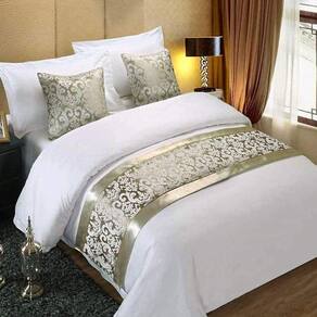 1 lençol com elástico para colchões de até 40 cm de altura - lençol branco algodão percal 200 fios. 1 edredom dupla face com enchimento 200cmx240cm - edredom branco algodão percal 200 fios, acabamento em estilo futon italiano totalmente embutido, sem a necessidade de costuras tradicionais prejudicando o visual do seu decor. 2 capas de travesseiros de 70cm x 50cm sem enchimento - capas em algodão percal 200 fios, com barra estilo italiano. 2 almofadas de 50x50cm em cetim gold light e detalhes em estampa digital estilo brasão real em cor off white - almofadas acompanham enchimento em fibra siliconada revestida por polipropileno. 1 peseira dupla face de 240cm por 0,80cm em cetim gold light em estampa digital estilo brasão real em cor off white. Atenção: não tralhamos com cobre leito, o kit não acompanha o lençol de cima.