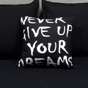 1 lençol com elástico com elástico para colchões de até 40cm de altura -Preto 1 edredom dupla face com enchimento 200x240cm - Preto 4 capas de travesseiros de 70cm x 50cm - Preto - Capa de travesseiro sem enchimento. 1 almofada exclusiva e a mais desejada da marca. 45cm x 45cm - preto com estampa em branco - Frase: Never give up your dreams Nunca desista dos seus sonhos