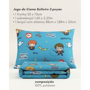 Transforme o quarto no seu pedacinho de Hogwarts com esse Jogo de Cama Harry Potter em microfibra (3 peças)! Pensado para fãs da saga mágica, ele inclui uma fronha (50 × 70 cm), um sobrelençol (1,40 m × 2,20 m) e um lençol com elástico (88 cm × 1,88 m × 20 cm), garantindo um ajuste perfeito e muito conforto. Feito com 100% poliéster, o tecido de microfibra seca rápido, amassa menos e é super prático, você nem precisa passar, e ele cabe tranquilamente na máquina de lavar.