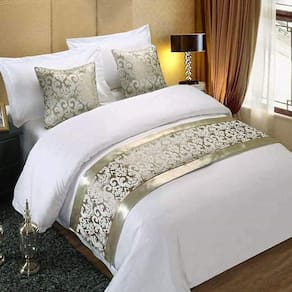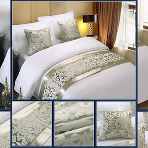 1 lençol com elástico para colchões de até 40 cm de altura - lençol branco algodão percal 200 fios. 1 edredom dupla face com enchimento 300cmx300cm - edredom branco algodão percal 200 fios, acabamento em estilo futon italiano totalmente embutido, sem a necessidade de costuras tradicionais prejudicando o visual do seu decor. 2 capas de travesseiros de 70cm x 50cm sem enchimento - capas em algodão percal 200 fios, com barra estilo italiano. 2 almofadas de 50x50cm em cetim gold light e detalhes em estampa digital estilo brasão real em cor off white - almofadas acompanham enchimento em fibra siliconada revestida por polipropileno. 1 peseira dupla face de 300cm por 0,80cm em cetim gold light em estampa digital estilo brasão real em cor off white. Atenção: não tralhamos com cobre leito, o kit não acompanha o lençol de cima.