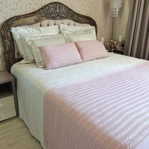 Jogo De Cama Vivain 01 Manta Tricô + 02 Rineiras Rosa Claro Kit com 03 peças em tricô: 01 peseira, 02 rineiras somente capa - Medidas da peseira: 2,60 x 0,80 m - Medidas da rineira: 35 x 55 cm - Cor do kit: rosa - Modelo do tricô: trança - Venda apenas do kit em tricô 01 unidade - As cores podem sofrer alterações conforme a configuração de sua tela Observações: - É recomendável que a lavagem seja feita à mão por se tratar de peças delicadas - Usar sabão neutro e amaciante não deixar de molho - Secar sempre à sombra - Não pendurar as peças no varal pode deformar Marca: Não Informado Ean: 7908245202827