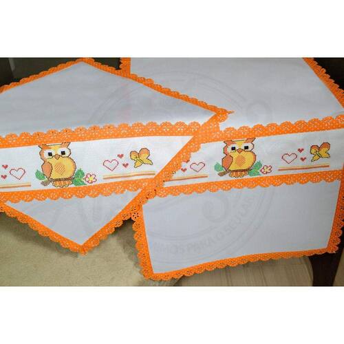 Jogo fabricado em tergal na cor branco, com barrado bordado em ponto cruz de uma linda corujinha, nas cores vermelho, preto, amarelo, laranja e marrom, acabamento em laise na cor laranja de bolinhas branca.