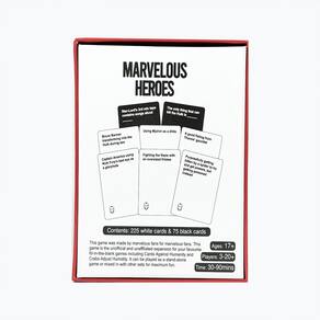 Material: papel Cor: vermelho Tamanho do pacote: 10 × 7,5 × 14 cm Peso do pacote: 0,63 kg Lista de embalagem: 1 x Conjunto de jogos de cartas de festa (50 cartas) Emocionante jogo de festa com tema de super-heróis — Marvelous Heroes é um divertido jogo de cartas social inspirado em temas heróicos, trazendo risadas e competição amigável para festas e reuniões. Perfeito para noites de jogos e festas — Ideal para noites de jogos em família, festas em casa, aniversários e encontros casuais, incentivando os jogadores a interagir e curtir um jogo humorístico juntos. Fácil de aprender e jogar — Regras simples facilitam a entrada rápida de novos jogadores. Compre cartas, complete desafios e compita com amigos em rodadas rápidas. Ótimo entretenimento em grupo — Projetado para vários jogadores, o jogo incentiva o trabalho em equipe, a criatividade e a interação social, tornando cada rodada emocionante e memorável. Conjunto de cartões durável e portátil — Feito de cartões de papel resistentes com uma caixa de armazenamento compacta que é fácil de transportar para viagens, festas ou reuniões de fim de semana.