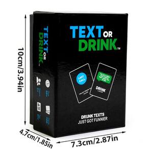 Material: papel Cor: preto Tamanho da embalagem: 10 × 7,5 × 5 cm Peso da embalagem: 0,21 kg Lista de embalagem: 1 x Party Card Game Deck (100 cartas) Hilarious Adult Party Game — Text or Drink é um jogo de cartas divertido e divertido desenvolvido para reuniões de adultos, com desafios ousados que criam risadas e momentos de festa inesquecíveis. Fácil de aprender e jogar — As regras são simples: compre uma carta e complete o desafio ou tome uma bebida. Perfeito para jogar rapidamente durante festas, noites de jogos ou reuniões sociais. Ótimo para festas e eventos sociais — Ideal para festas em casa, aniversários, pré-bebidas, noites de bar e comemorações em que os amigos querem desfrutar de um divertido e interativo jogo de bebidas. 100 cartas de desafio divertidas — incluem uma grande variedade de dicas e desafios que mantêm o jogo empolgante e imprevisível, incentivando interações hilárias entre os jogadores. Design compacto e portátil — O deck leve vem em uma caixa resistente que é fácil de transportar, tornando-o conveniente para viagens, festas, acampamentos ou reuniões de fim de semana.