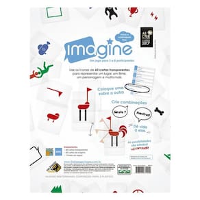 Jogo de Cartas - Imagine - Galápagos Em Imagine os jogadores terão a tarefa de se comunicar sem usar palavras, a fim de solucionar as cartas de enigmas que serão utilizadas a cada rodada. Usando apenas cartas transparentes, muita imaginação e criatividade, os jogadores devem criar, animar, sobrepor e dar vida às cartas para fazer com que os outros jogadores descubram o que está por trás do enigma com uma dica simples como Animal ou Expressão. Recomendação: Recomendado para crianças a partir de 8 anos de idade. Código de Barras: 7898572674209 Itens Inclusos: 1 Livro de Regras, 60 Cartas Transparentes, 60 Cartas de Enigma Restrição de Idade: Não recomendável para menores de 3 anos por conter peças pequenas que podem ser engolidas. Composição / Material: Papel, Papel Cartão, Plástico