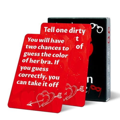 Material: papel Cor: vermelho Tamanho do pacote: 9 × 6,5 × 1,8 cm Peso do pacote: 0,08 kg Lista de embalagem: 1 x conjunto de jogos de cartas para casais (50 cartas) Jogo divertido de quarto para casais — Este jogo de cartas inclui 50 perguntas divertidas e desafios ousados, projetados para trazer emoção, risadas e uma conexão mais profunda aos casais durante encontros noturnos ou momentos privados. Iniciadores de conversas românticas e sedutoras - Cada cartão incentiva a comunicação aberta, provocações divertidas e interação lúdica, ajudando casais a explorar a intimidade e fortalecer seu relacionamento. Perfeito para entretenimento noturno — Ideal para casais que desejam adicionar emoção às noites de namoro, aniversários, férias ou noites privadas, juntamente com desafios divertidos e envolventes. Jogabilidade simples e fácil — Os jogadores simplesmente compram uma carta e seguem as instruções ou desafios, criando momentos espontâneos que mantêm o jogo emocionante e imprevisível. Baralho de cartas compacto e portátil — Cartas leves com uma caixa de armazenamento protetora tornam este jogo fácil de transportar para viagens, festas ou noites românticas em qualquer lugar.