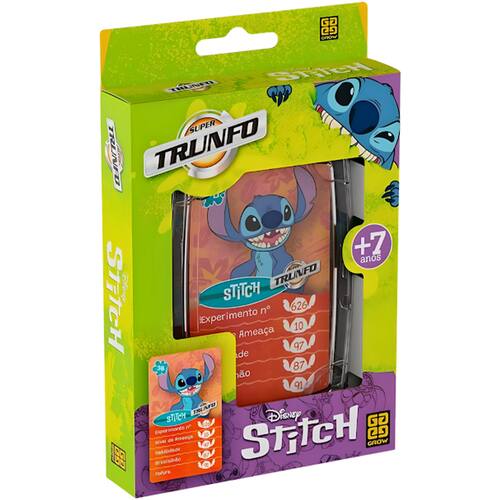 Descrição do produto : São 32 cartas com ilustrações e informações da turma do Stitch. Em qual item o personagem da sua carta é melhor? Será na habilidade? Na fofura? Ou você tem o Super Trunfo? : Detalhes técnicos : Marca: Grow : Referência: 04688 : Idade recomendada: 7 : Possui Luzes: Não : Possui Sons: Não : Dimensões aproximadas da embalagem: 15,8 x 10,1 x 2,3 cm (A x L x C) : Ean: 7908010146882 : Componentes : 1 Caixa Plástica, 32 Cartas e 1 regra :