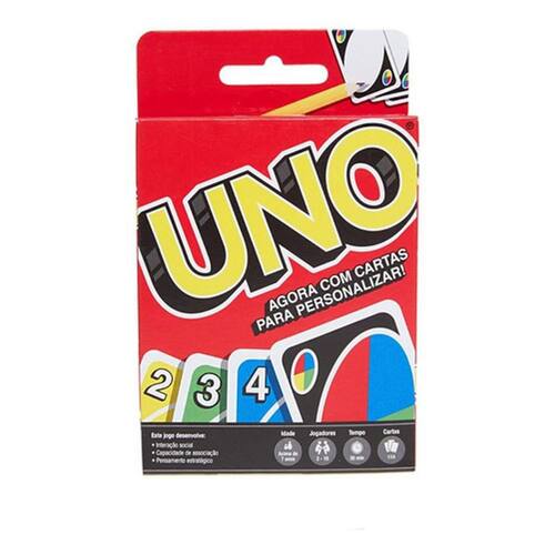 Jogo de cartas uno baralho lacrado 114 cartas Jogo de cartas uno cartonado O jogo de cartas uno é diversão para toda a família. É preciso ser esperto para vencer e atrapalhar os adversários. Livre-se depressa de suas cartas, combine cores e números. Use as cartas de ação para atrapalhar os oponentes. Vence quem conseguir ficar sem cartas primeiro. Uma divertida brincadeira que promove interação, estratégia e raciocínio. Como jogar: jogue as cartas que combinarem com a cor, número ou símbolo daquela que estiver no monte de descarte Especificações: Faixa etária: a partir de 06 anos - dimensões aproximadas da embalagem cxlxa : 2x10x11,5cm - peso aproximado: 0,275kg Conteúdo: 110 cartas. contra defeitos de fabricação. Marca: Não Informado Ean: 7900011696069