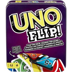 O UNO FLIP! é o jogo de cartas clássico que você já conhece e agora com um novo toque de emoção. O baralho duplo e a carta especial Flip dão ao jogo clássico uma vantagem maior. Jogue a carta especial Flip, e todas as cartas são viradas, incluindo a pilha de jogo, para mostrar um conjunto totalmente novo de números e cores no lado oposto. O UNO FLIP! também inclui cartas de ação novas e divertidas, como Comprar 5 e Pular todos.