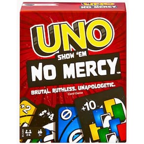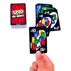 UNO Show 'em No Mercy é o nosso jogo UNO mais brutal até agora! Tem muito mais cartas com penalidades MUITO mais duras (sortear 10 cartas alguém?) e novas regras que terão jogadores empilhando, trocando e sacando mais cartas do que nunca! E há até uma Regra da Misericórdia (sim, temos a ironia) se as coisas ficarem muito difíceis. Há duas maneiras de ganhar nesta versão impiedosa do jogo clássico: livrar-se de todas as cartas OU derrubar todos os outros jogadores do jogo! Ah, e se você conseguir chegar a um cartão, não se esqueça de gritar "UNO!"