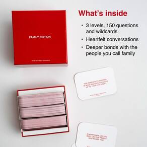 - O QUE HÁ DENTRO - 150 cartões de conversação e curingas, bloco de notas WNRS, 2 lápis e 2 cartões transparentes de “Dig Deeper”, que incentivam os jogadores a se abrirem ainda mais e fortalecerem seus relacionamentos. Para 2 a 6 jogadores, maiores de 15 anos. Aviso: sentimentos podem surgir.