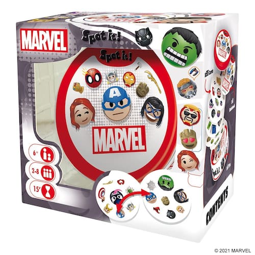 Zigomático Spot It! Marvel Emojis - Jogo de cartas da família Marvel Super Heroes para diversão com super-heróis! Jogo de combinação rápido para crianças e adultos, maiores de 6 anos, 2 a 8 jogadores, 15 minutos de diversão, feito - ABRACE O UNIVERSO MARVEL: Descubra! Marvel Emojis combina os personagens icônicos dos quadrinhos da Marvel com o clássico jogo familiar de observação. - BATALHA DE OBSERVAÇÃO RÁPIDA: Participe de uma batalha divertida de observação rápida ao identificar o único símbolo correspondente entre duas cartas, com os super-heróis da Marvel favoritos dos fãs, como Homem de Ferro, Capitão América e Viúva Negra, em forma de emoji. - MARVEL IN EMOJIS: esta nova versão do Spot It! apresenta personagens conhecidos e amados da Marvel representados na adorável forma de Emoji. - PORTÁTIL E RÁPIDO: Descubra! é rápido de aprender, fácil de ensinar e sua embalagem de lata portátil o torna o jogo perfeito para levar para qualquer lugar. - DIVERSÃO EM FAMÍLIA: aprimore suas habilidades de observação e reflexos ultrarrápidos com cinco modos de jogo diferentes que desafiam toda a família a identificar símbolos iguais e chamá-los!